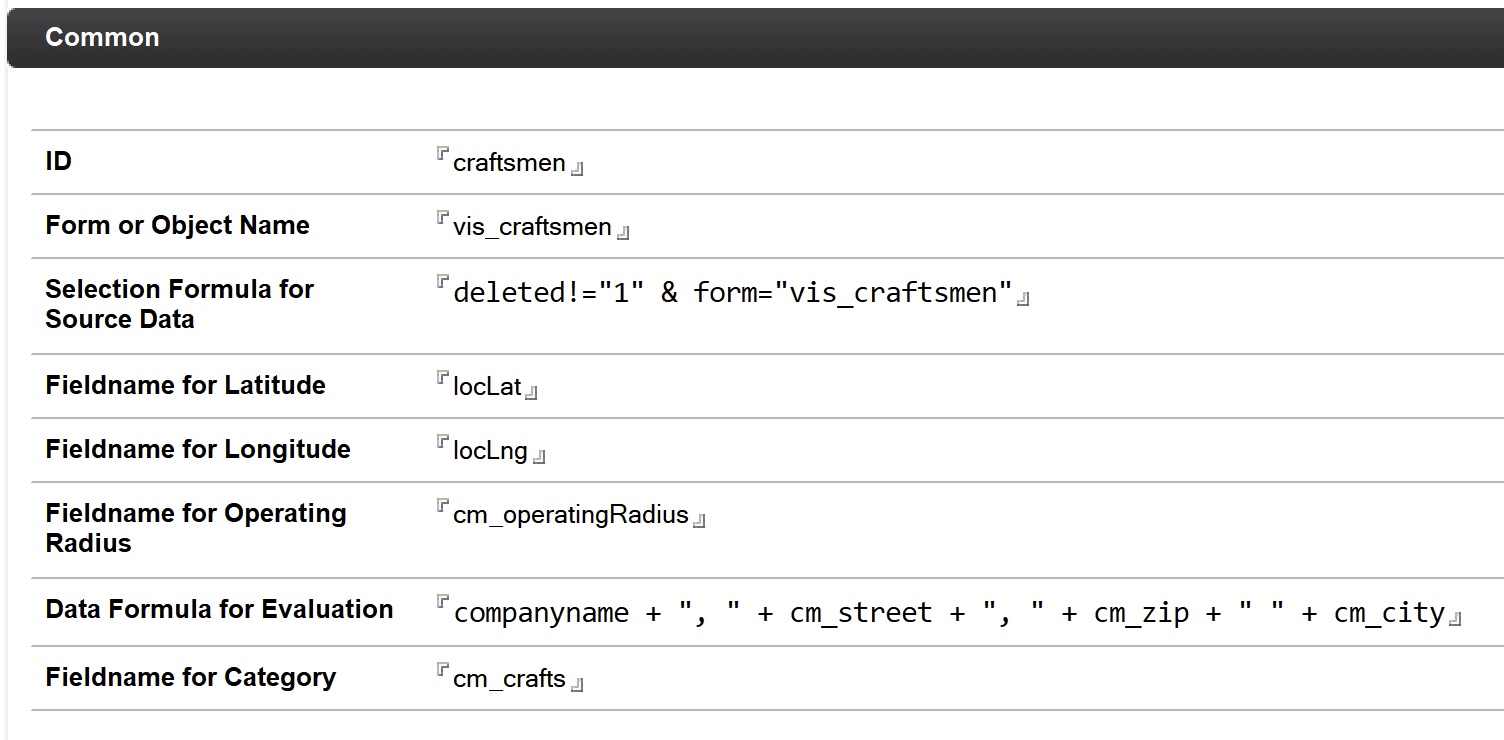| Fieldname for Operating Radius | Feld, welches den Einsatzradius z.B. für den Handwerker enthält |