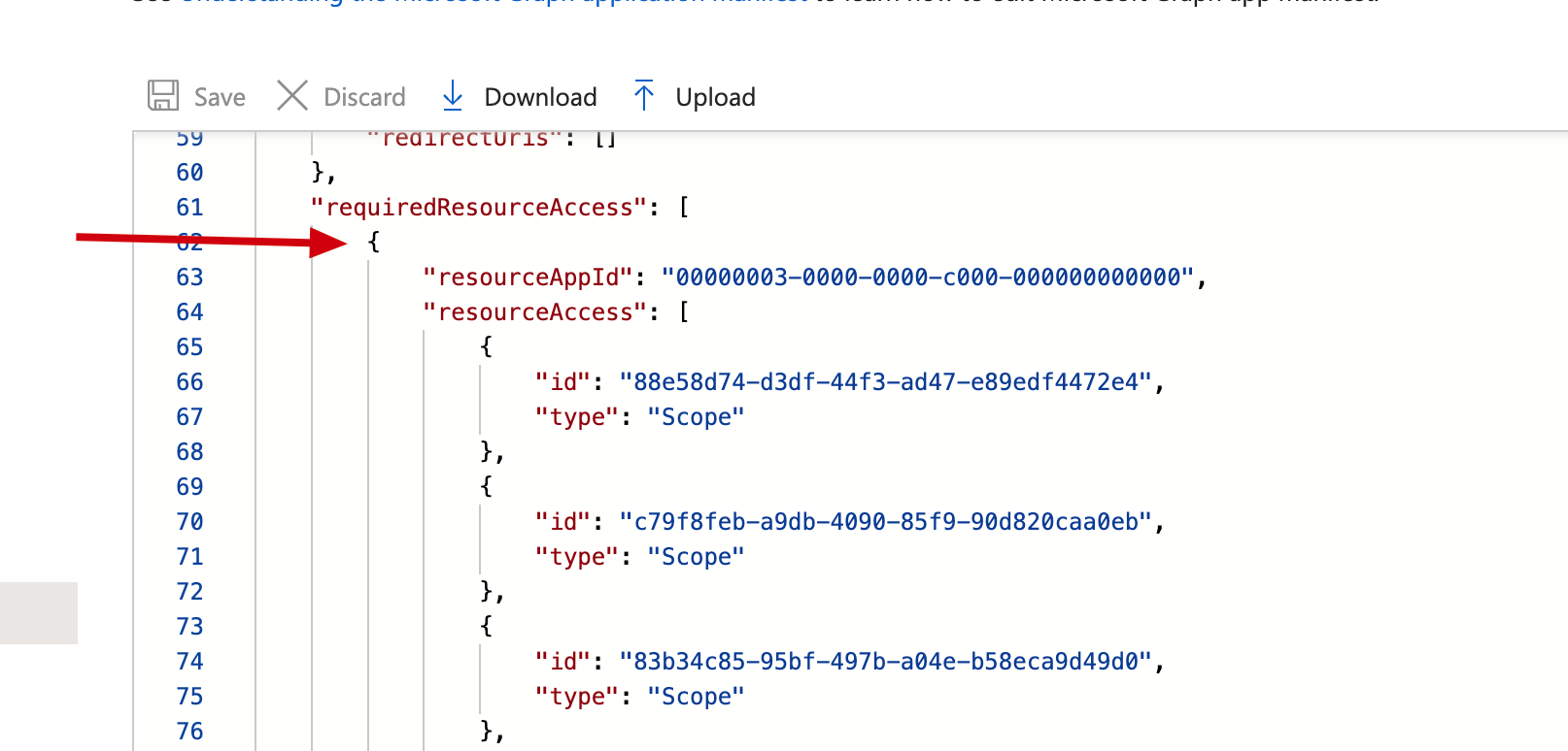 Für den Wert requiredResourceAccess kann folgender Code-Block in die eckigen Klammern eingefügt werden: