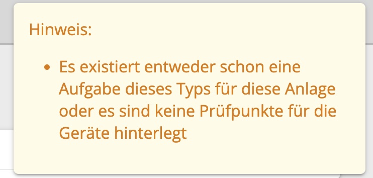 | Es existiert entweder schon eine Aufgabe dieses Typs für diese Anlage oder es sind keine Prüfpunkte für die Geräte hinterlegt | In der Regel gibt es für die Gerätekonstellation keine Prüfpunkte | Legen Sie Prüfpunkte für die VDMA-Geräteeinsazuzwecke, die genutzt werden, an |