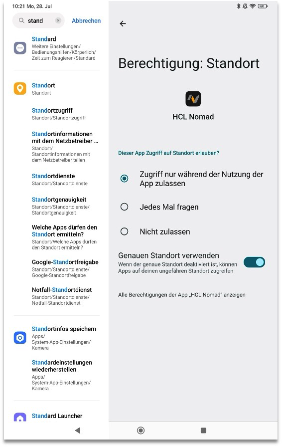 Abschließend muss in den Einstellungen des Betriebssystems die Nutzung des Standortzugriffs aktiviert werden. Zusätzlich muss die Option „Genauen Standort verwenden“ aktiviert werden.