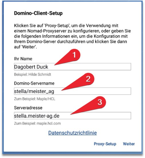 - (3) Die Serveradresse (der Hostname, den Sie uns vor dem Setup genannt haben)