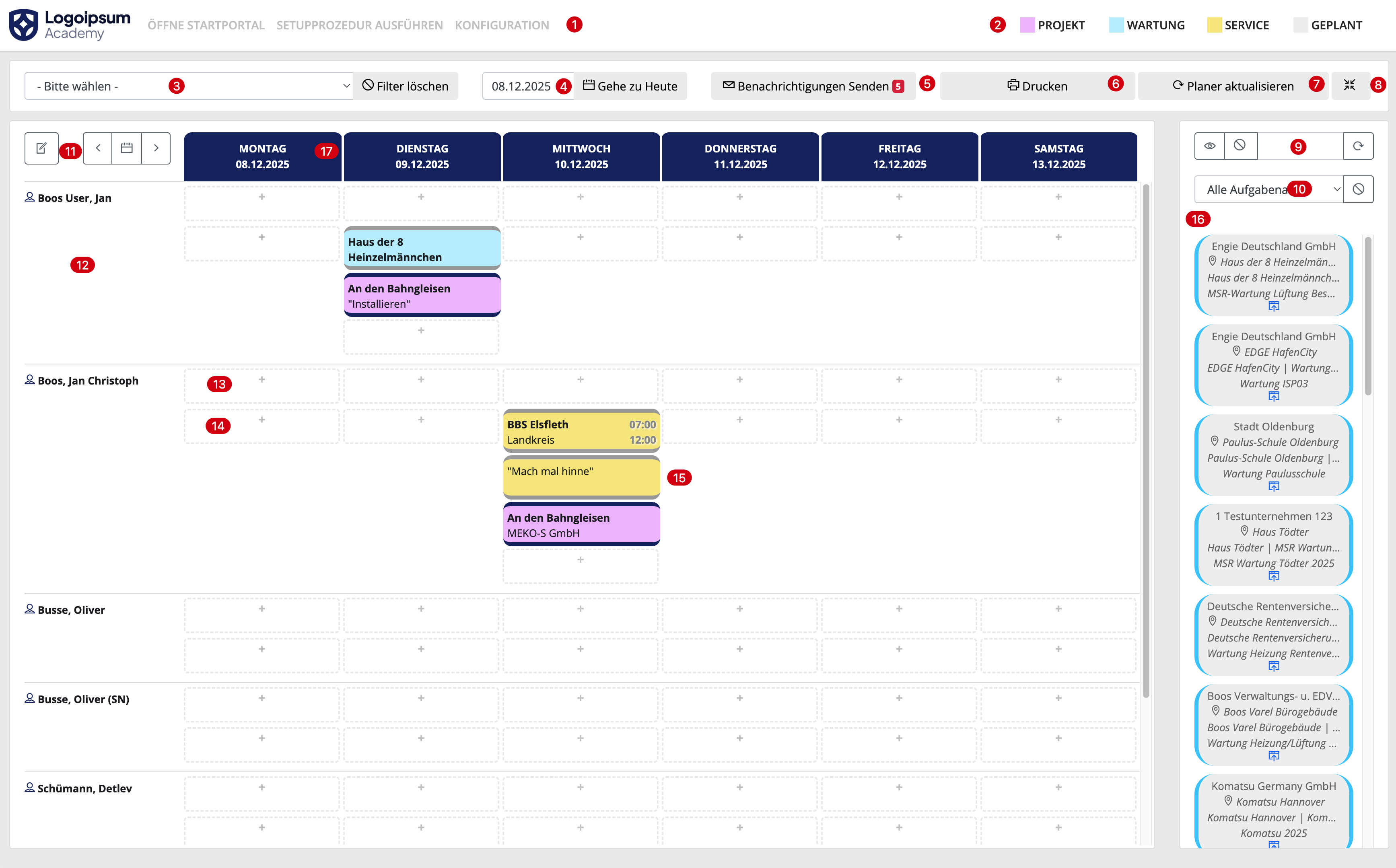 - Planung von max. 2 Einsätzen pro Tag, vormittags, nachmittags und ganztägig. Es erfolgt eine Prüfung auf Belegung