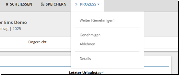 Jetzt können Sie oben unter dem Reiter „Prozess“, entweder auf „weiter Ge-nehmigen“ oder auf „Genehmigen/Ablehnen“ klicken.