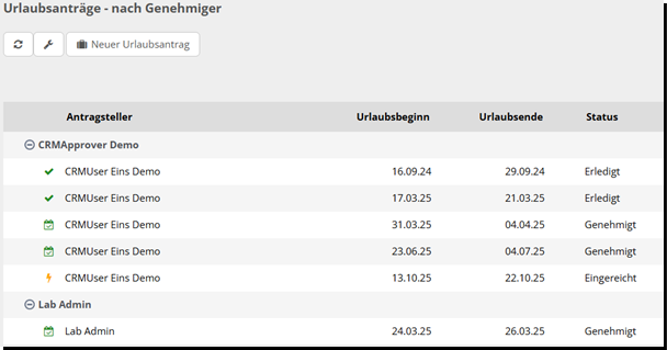 Unter „nach Antragsteller“ kann der Genehmiger die Urlaubsanträge seiner User und den Status der Anträge einsehen.