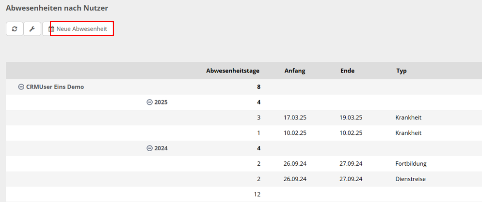 Unter "Abwesenheit nach Nutzer" können Sie alle Ihre Abwesenheiten (Krankheit, Fortbildung, Dienstreise etc.) einsehen und bearbeiten.