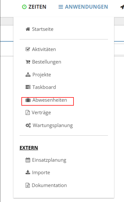 Nach dem Login mit Ihrem persönlichen Zugang gelangen Sie direkt zur Startseite. Oben rechts im Menü finden Sie den Reiter „Anwendungen“ – dort ist der Menüpunkt „Abwesenheiten“ hinterlegt, über den Sie auf alle Funktionen rund um Urlaubsplanung und Abwesenheiten zugreifen können.