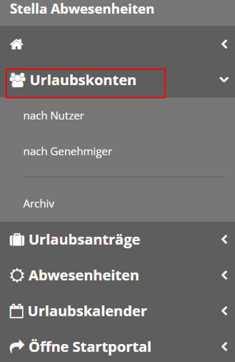 In der Navigationsleiste unter dem Menüpunkt „Urlaubskonten“ können Sie zwischen den Ansichten „nach Nutzer“ und „nach Genehmiger“ wählen. Dadurch lassen sich die Urlaubskonten gezielt aus unterschiedlichen Perspektiven einsehen und verwalten.