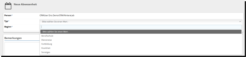 Dort können Sie den Grund der Abwesenheit angeben z.B. Berufsschule, Dienstreise, Fortbildung, Krankheit oder sonstiges.
