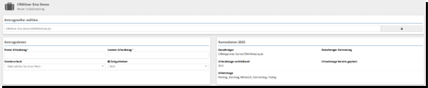 Rechts sehen Sie weiterhin Ihr Urlaubskonto sowie unten eine Liste Ihrer bisherigen Anträge.