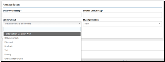Sie geben den gewünschten Urlaubszeitraum an. Falls es sich nicht um den regulären Jahresurlaub handelt, können Sie unter „Sonderurlaub“ den Grund eintragen.