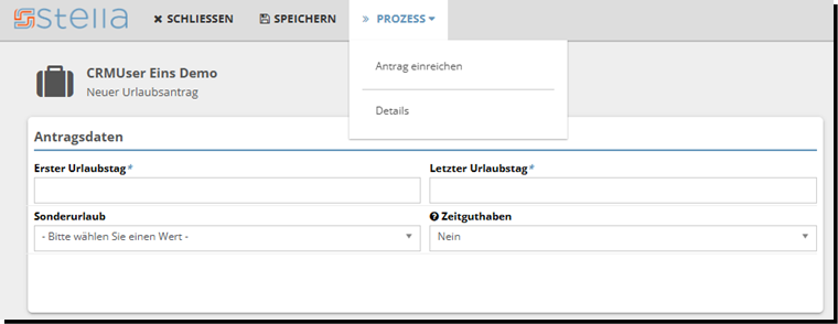 Anschließend klicken Sie auf „Antrag einreichen“. Nun wird der Antrag an den Genehmiger gesendet, der diesen dann bearbeitet.