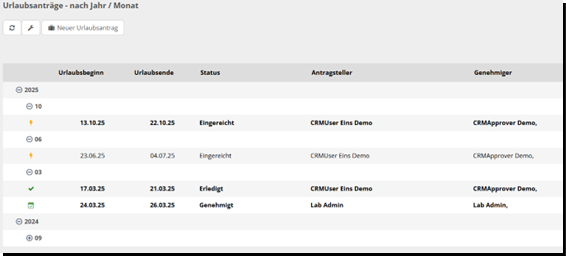 In der Navigationsleiste unter dem Reiter „Urlaubsanträge“ stehen Ihnen verschiedene Ansichtsoptionen zur Verfügung: „meine Anträge“, „nach Antragsteller“, „nach Genehmiger“, „nach Jahr/Monat“ sowie „nach Status“. So können Sie die Urlaubsanträge gezielt filtern und auswerten – je nachdem, welche Perspektive oder Detailtiefe Sie benötigen.