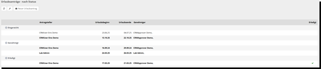 "Nach Status": Anzeige aller Anträge nach ihrem Status (eingereicht, genehmigt usw.).