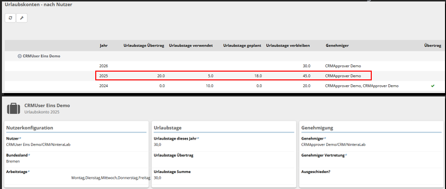 Unter „nach Genehmiger“ sehen Sie Ihr Urlaubskonto und Ihren Genehmiger.